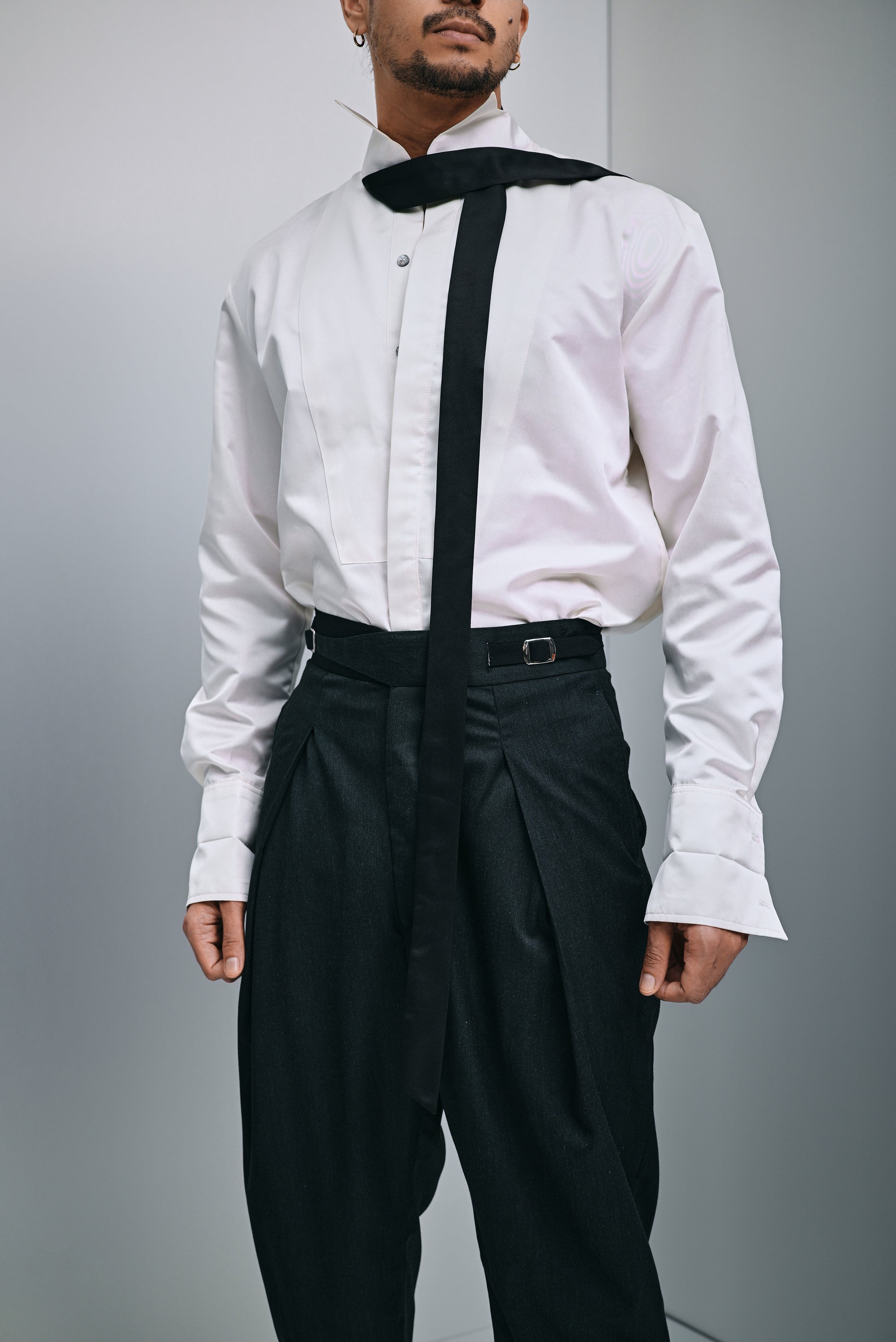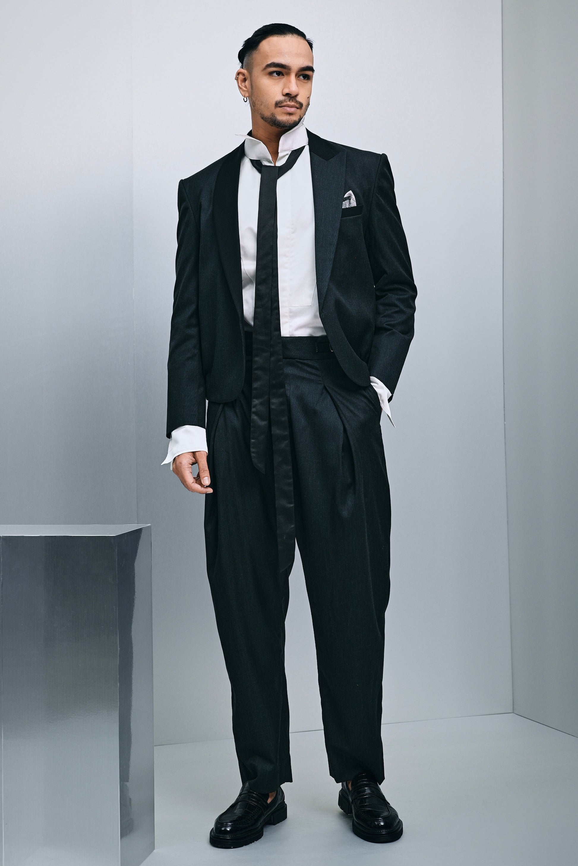 A striking hybrid silhouette that merges tailored elegance with contemporary edge. This cropped tuxedo-bomber suit features structured pleated trousers and a statement contrast lapel crafted from luxurious wool blend fabric. The rich deep evergreen palette delivers understated luxury, perfect for those who embrace refined style with an unexpected twist.